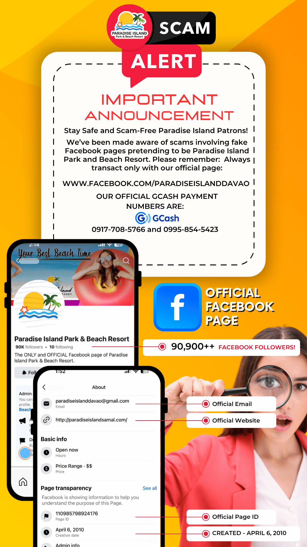 We’ve been made aware of scams involving fake Facebook pages pretending to be Paradise Island Park and Beach Resort. Please remember: Always transact only with our official page: